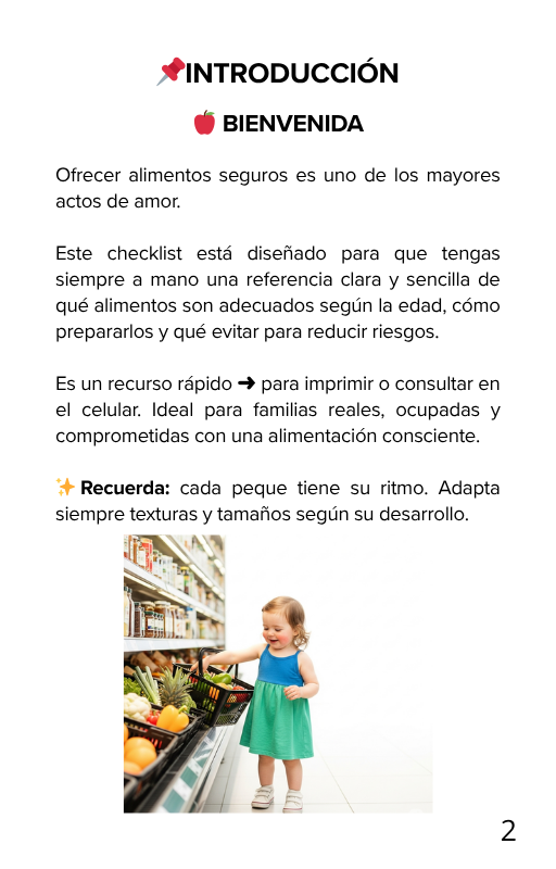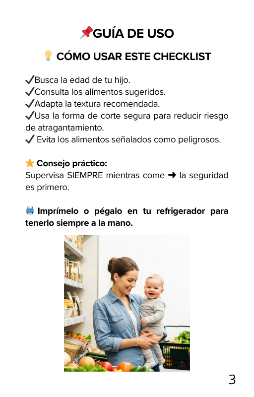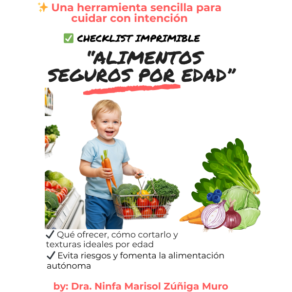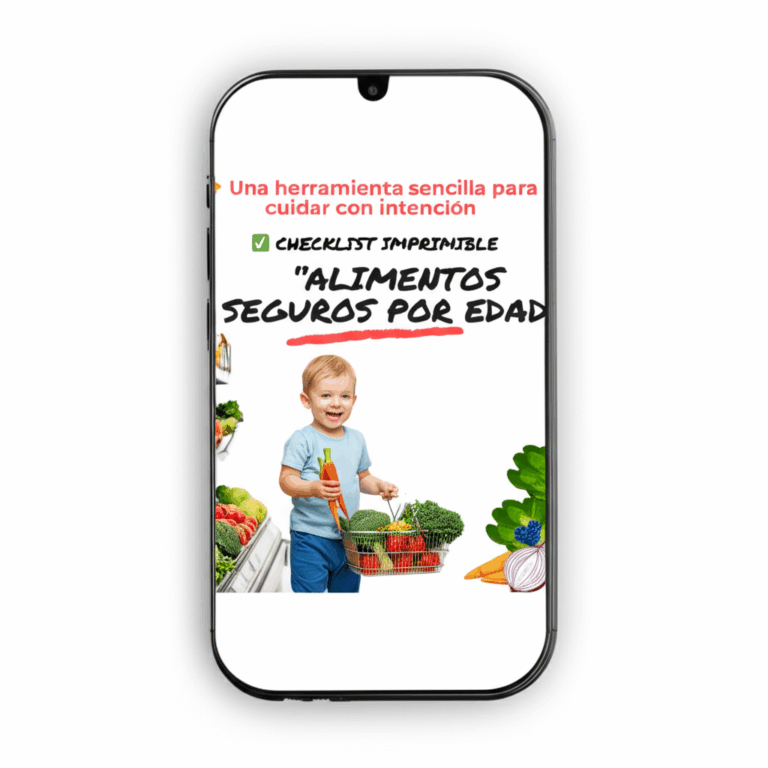 Con nuestro Checklist Imprimible “Alimentos Seguros por Edad” tendrás siempre a mano una guía visual clara y sencilla para saber exactamente qué alimentos ofrecer según la etapa, cómo cortarlos y qué texturas son más seguras.