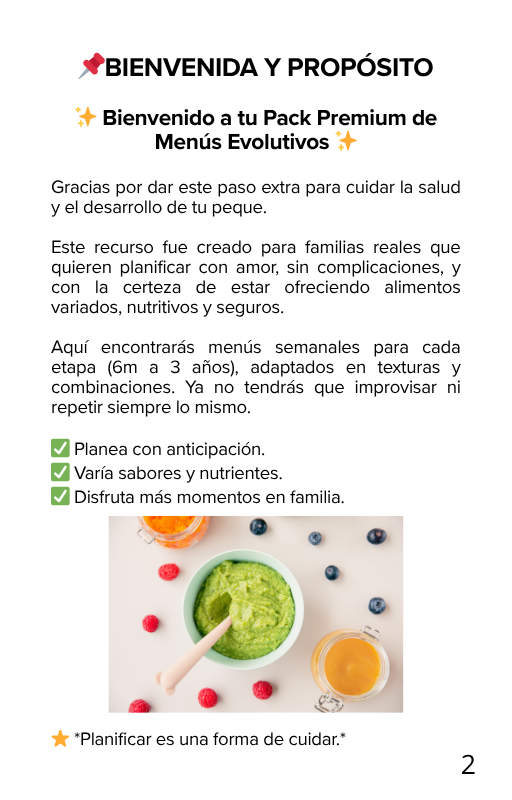 Este pack premium incluye más de 50 páginas con menús evolutivos semanales, clasificados por edad, adaptados a cada etapa única del desarrollo, claros y seguros.
